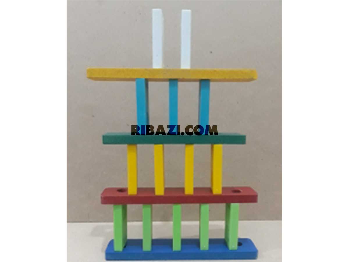 - علی مهره های کیت ریبازی را برای بالا بردن دقت خود، مثل تصویر بالا روی هم چیده است. علی مهره آبی را 100 ریال، مهره نارنجی را 50 ریال، مهره مشکی را 10 ریال و مهره قرمز را یک ریال خریده است. قیمت سازه ای که علی ساخته است، چند ریال است؟